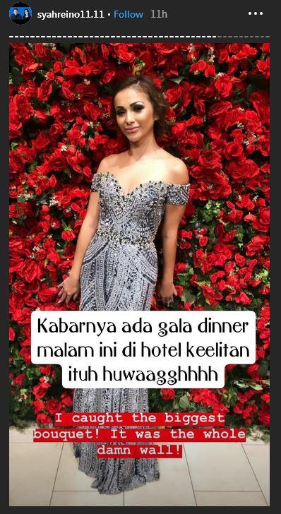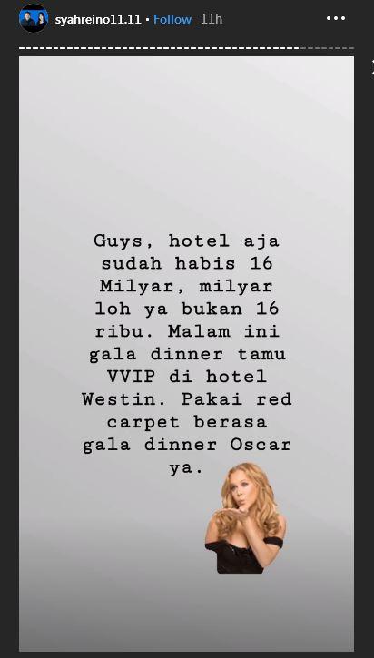 "Guys, hotel aja sudah habis Rp 16 miliar loh ya bukan Rp 16 ribu. Malam ini gala dinner tamu VVIP di hotel Westin. Pakai res carpet berasa gala dinner Oscar ya," tulis akun Instagram @syahreino11.11
